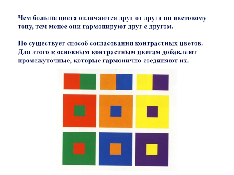 Слайд 38Чем больше цвета отличаются друг от друга по цветовому тону,