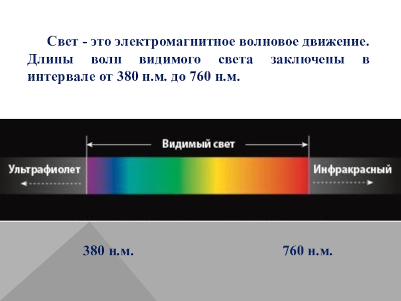 Слайд 5Свет - это электромагнитное волновое движение. Длины волн видимого света