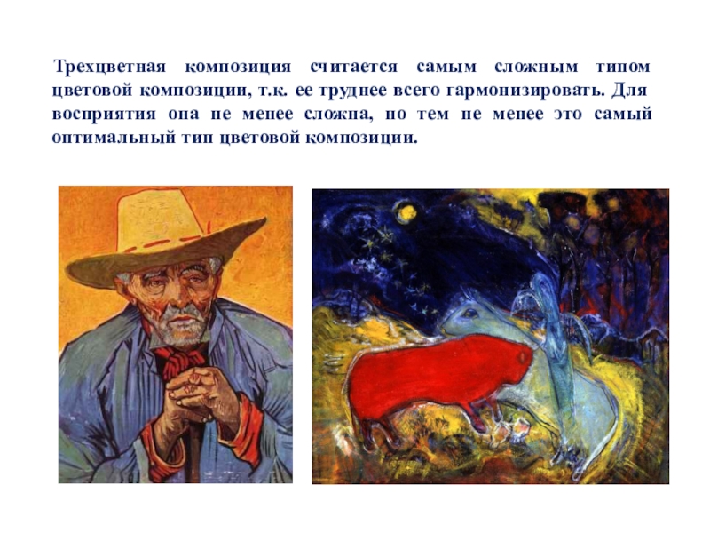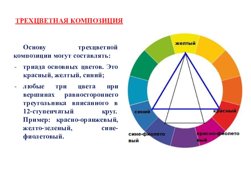 Слайд 53Трехцветная композиция считается самым сложным типом цветовой композиции, т.к. ее
