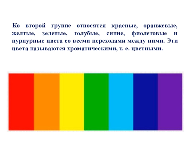 Слайд 13Ко второй группе относятся красные, оранжевые, желтые, зеленые, голубые, синие,