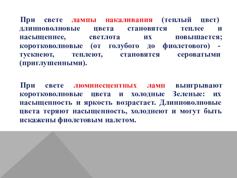 Слайд 33При свете лампы накаливания (теплый цвет) длинноволновые цвета становятся теплее