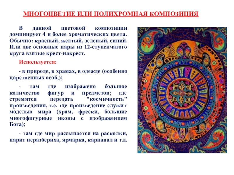 - там где изображено большое количество фигур и предметов; где стремятся передать "космичность" произведения, т.е. где произведение служит моделью мира (храм, фрески, большие многофигурные иконы с изображением Бога);