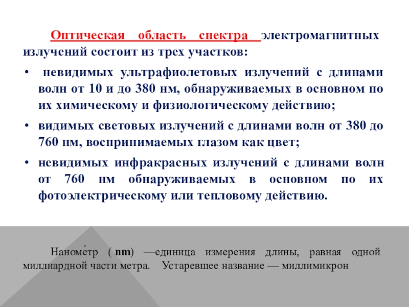 Слайд 6Оптическая область спектра электромагнитных излучений состоит из трех участков: