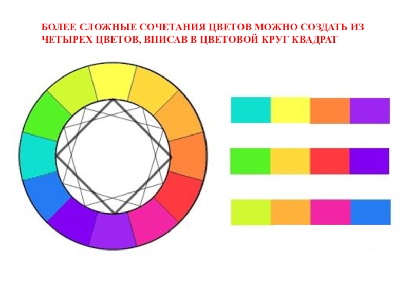 Слайд 44Более сложные сочетания цветов можно создать из четырех цветов, вписав