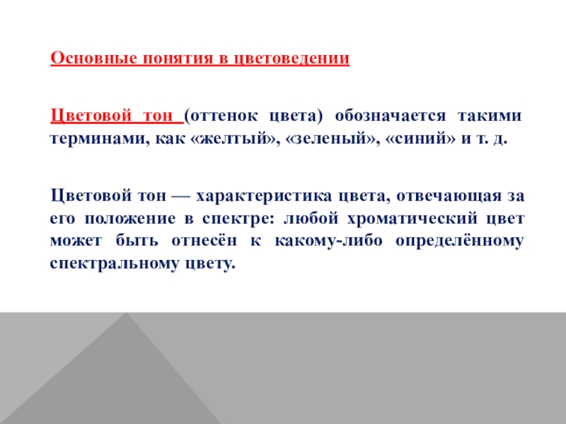 характеристика цвета, отвечающая за его положение в спектре: любой хроматический цвет может быть отнесён к какому-либо определённому спектральному цвету.
