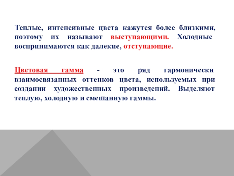 Слайд 29Теплые, интенсивные цвета кажутся более близкими, поэтому их называют выступающими.