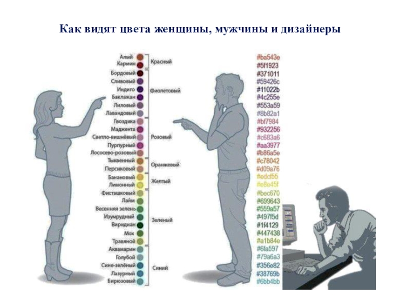 Слайд 32Как видят цвета женщины, мужчины и дизайнеры