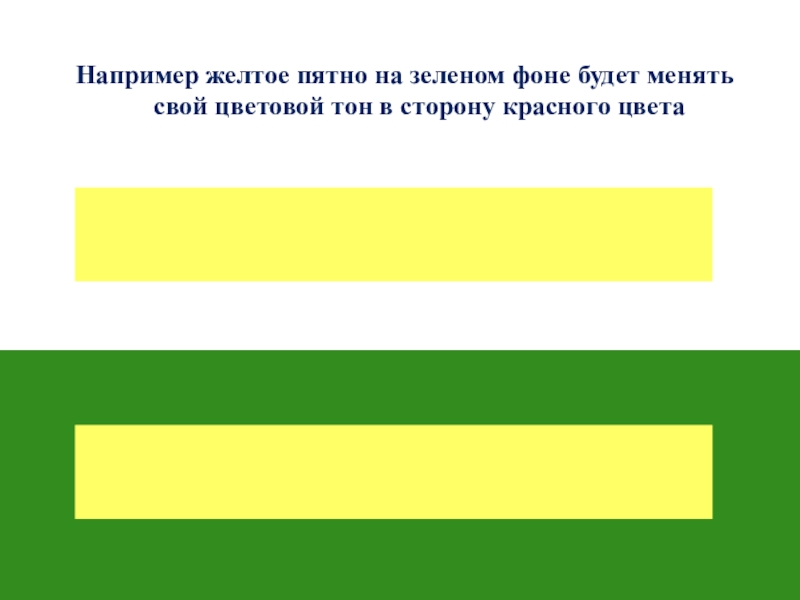 Слайд 25Например желтое пятно на зеленом фоне будет менять свой цветовой