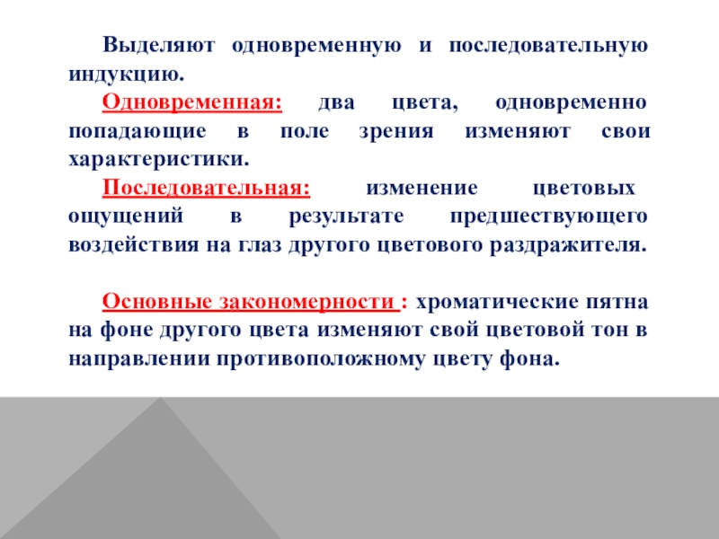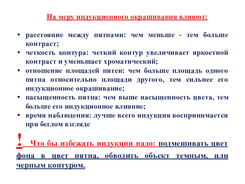 Основные закономерности : хроматические пятна на фоне другого цвета изменяют свой цветовой тон в направлении противоположному цвету фона.