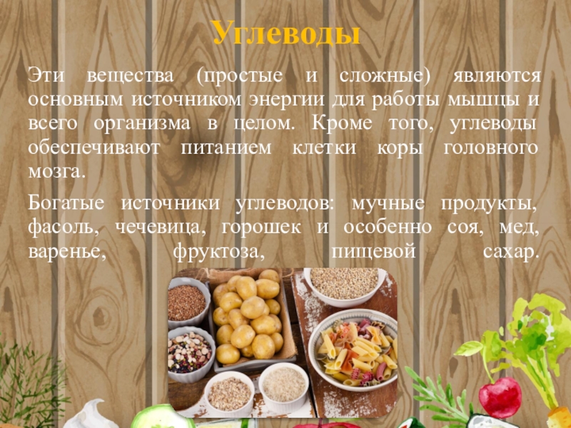 Богатые источники углеводов: мучные продукты, фасоль, чечевица, горошек и особенно соя, мед, варенье, фруктоза, пищевой сахар.