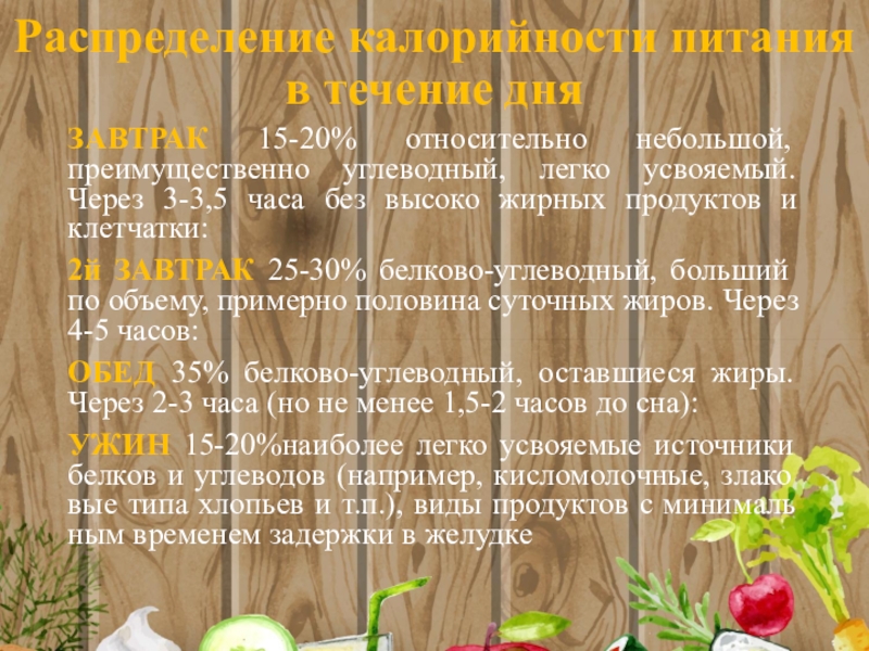 УЖИН 15-20%наиболее легко усвояемые источники белков и углеводов (например, кисломолочные, злако вые типа хлопьев и т.п.), виды продуктов с минималь ным временем задержки в желудке
