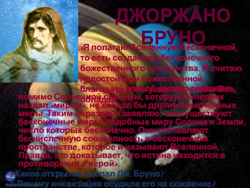 «Я полагаю Вселенную бесконечной, то есть созданием бесконечного божественного могущества. Я считаю недостойным божественной благодати и могущества, чтобы Бог, обладая