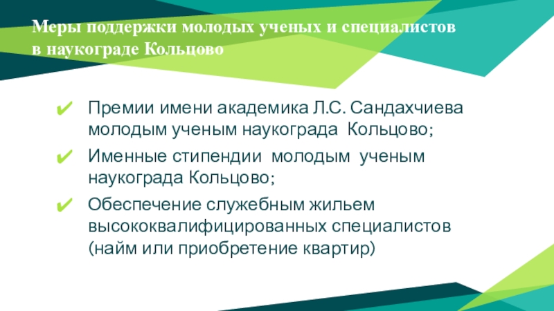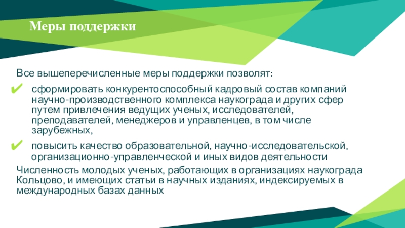 Слайд 2Меры поддержки молодых ученых и специалистов в наукограде Кольцово