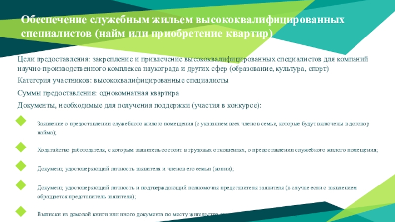 Слайд 5Обеспечение служебным жильем высококвалифицированных специалистов (найм или приобретение квартир)