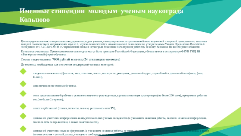 Категория участников: Претендентами на стипендию могут быть граждане Российской Федерации, обучающиеся в аспирантуре ФБУН ГНЦ ВБ «Вектор» по очной форме обучения.