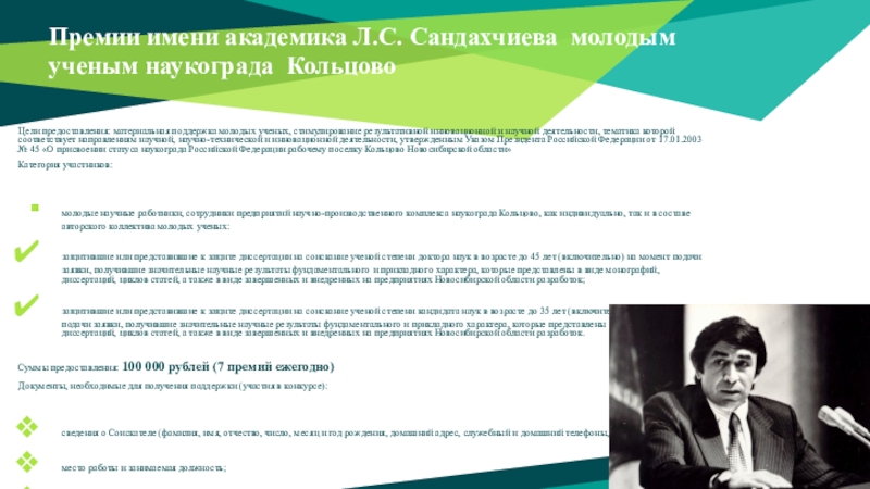 Слайд 3Премии имени академика Л.С. Сандахчиева молодым ученым наукограда Кольцово