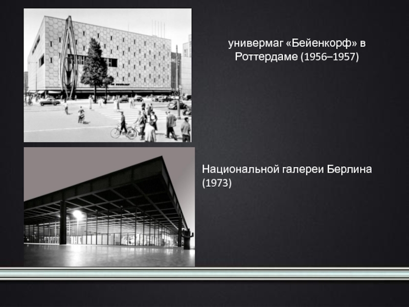 универмаг «Бейенкорф» в Роттердаме (1956–1957)Национальной галереи Берлина (1973)