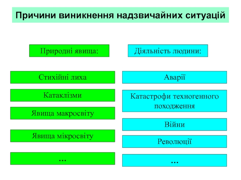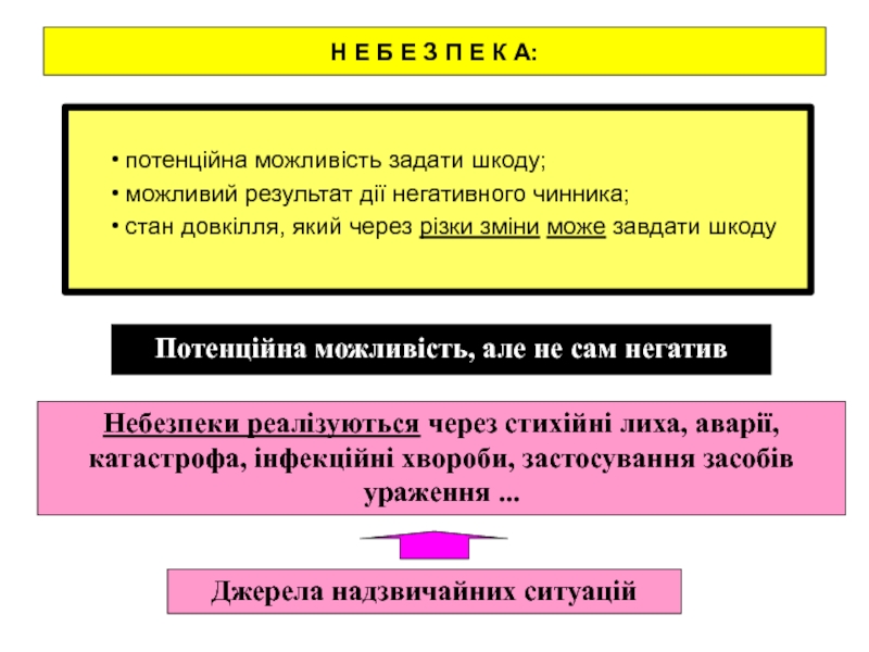 Небезпеки реалізуються через стихійні лиха, аварії, катастрофа, інфекційні хвороби, застосування засобів ураження ...