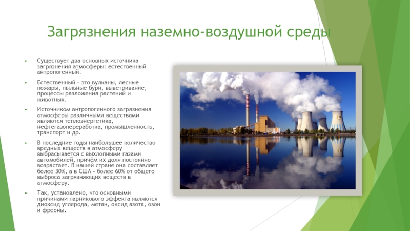 Существует два основных источника загрязнения атмосферы: естественный антропогенный.