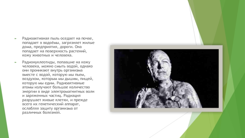 Слайд 16Радиоактивная пыль оседает на почве, попадает в водоёмы, загрязняет жилые
