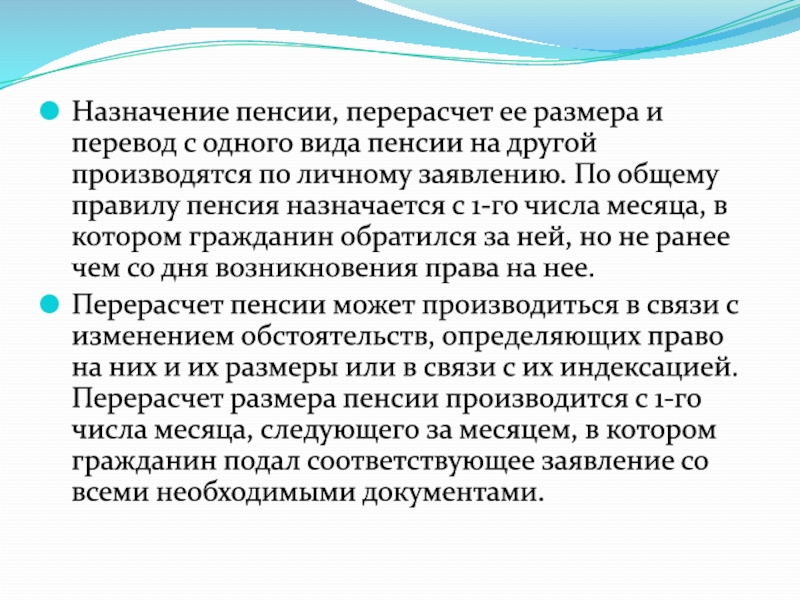 Слайд 2Назначение пенсии, перерасчет ее размера и перевод с одного вида