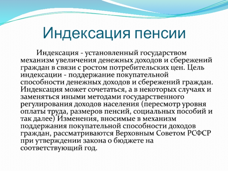 Индексация пенсии		Индексация - установленный государством механизм увеличения денежных доходов и сбережений граждан в связи с ростом потребительских