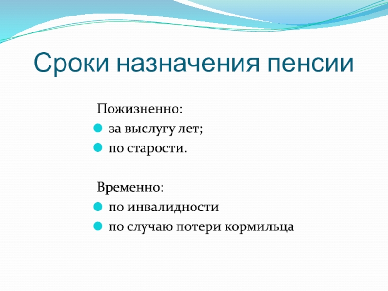 Сроки назначения пенсииПожизненно:за выслугу лет;по старости.Временно:по инвалидностипо случаю потери кормильца