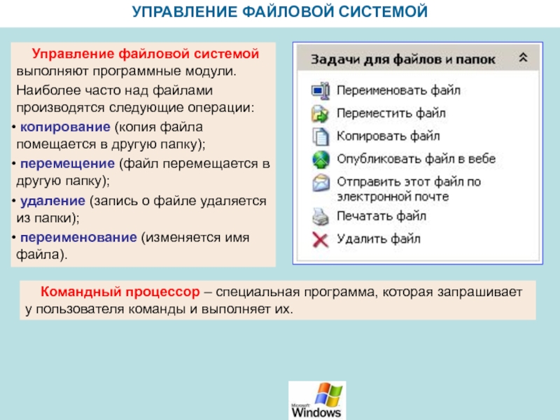 УПРАВЛЕНИЕ ФАЙЛОВОЙ СИСТЕМОЙ  Управление файловой системой выполняют программные модули.Наиболее часто над файлами производятся следующие операции: копирование