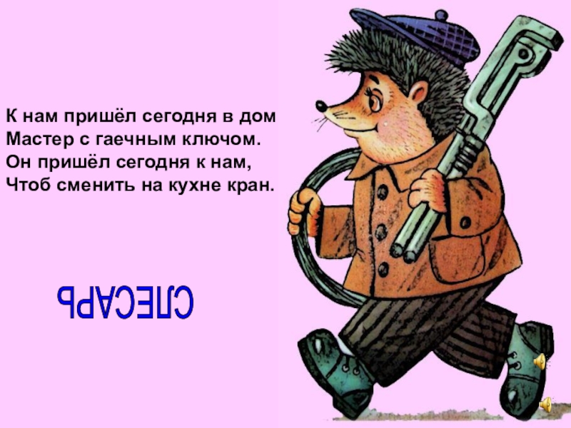 К нам пришёл сегодня в домМастер с гаечным ключом.Он пришёл сегодня к нам,Чтоб сменить на кухне кран.СЛЕСАРЬ