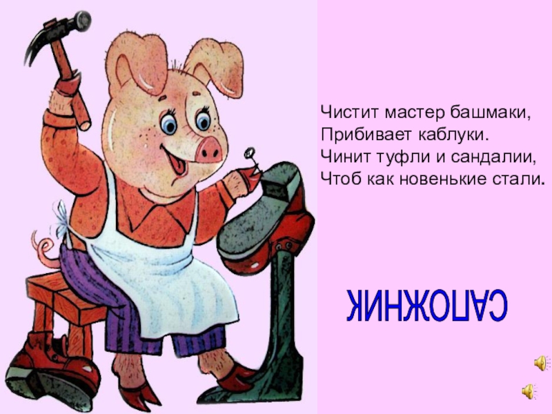 Чистит мастер башмаки,Прибивает каблуки.Чинит туфли и сандалии,Чтоб как новенькие стали.САПОЖНИК