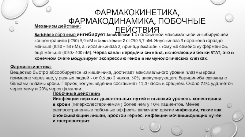 Вещество быстро абсорбируется из кишечника, достигает максимального уровня плазмы крови примерно через час, у разных людей - от 0,5 до 3 часов. 50% циркулирующего барициниба связаны с белками плазмы крови. Период полувыведения составляет 12,5 часов в среднем. Около 75% удаляется через мочу и 20% через фекалии.