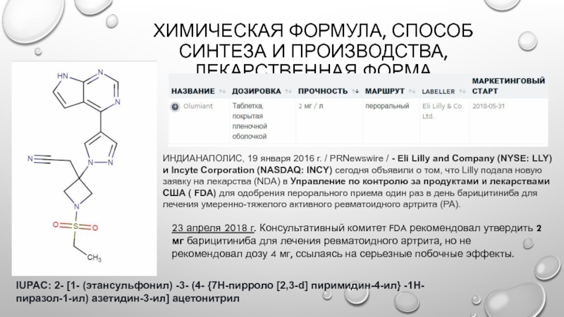 ИНДИАНАПОЛИС, 19 января 2016 г. / PRNewswire / - Eli Lilly and Company (NYSE: LLY) и Incyte Corporation (NASDAQ: INCY) сегодня объявили о том, что Lilly подала новую заявку на лекарства (NDA) в Управление по контролю за продуктами и лекарствами США ( FDA) для одобрения перорального приема один раз в день барицитиниба для лечения умеренно-тяжелого активного ревматоидного артрита (РА).