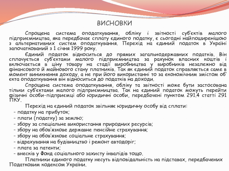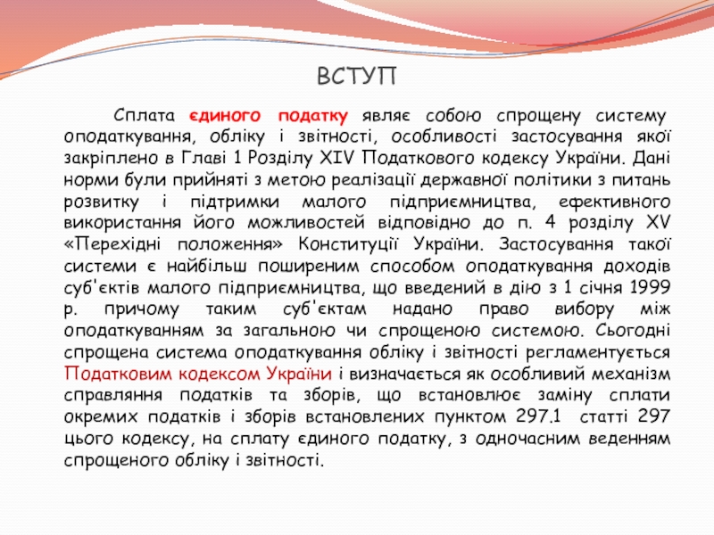 Податкового кодексу України. Дані норми були прийняті з метою реалізації державної політики з питань розвитку і підтримки малого підприємництва, ефективного використання його можливостей відповідно до п. 4 розділу XV «Перехідні положення» Конституції України. Застосування такої системи є найбільш поширеним способом оподаткування доходів суб'єктів малого підприємництва, що введений в дію з 1 січня 1999 р. причому таким суб'єктам надано право вибору між оподаткуванням за загальною чи спрощеною системою. Сьогодні спрощена система оподаткування обліку і звітності регламентується Податковим кодексом України і визначається як особливий механізм справляння податків та зборів, що встановлює заміну сплати окремих податків і зборів встановлених пунктом 297.1 статті 297 цього кодексу, на сплату єдиного податку, з одночасним веденням спрощеного обліку і звітності.