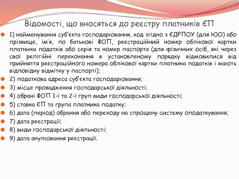 Слайд 13Відомості, що вносяться до реєстру платників ЄП