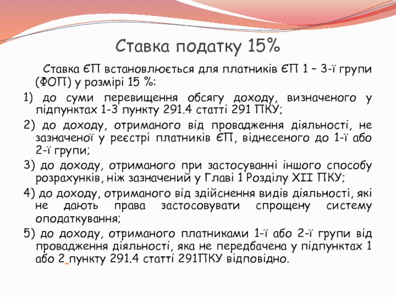 5) до доходу, отриманого платниками 1-ї або 2-ї групи від провадження діяльності, яка не передбачена у підпунктах 1 або 2 пункту 291.4 статті 291ПКУ відповідно.