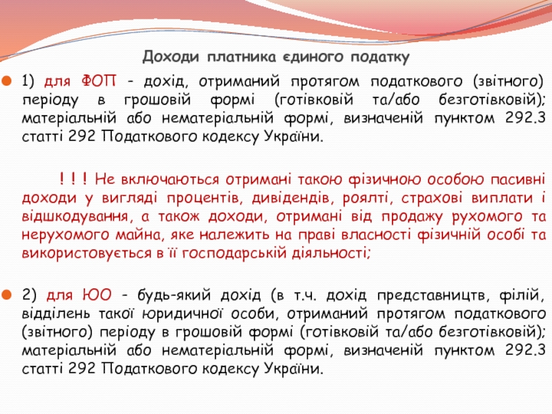 2) для ЮО - будь-який дохід (в т.ч. дохід представництв, філій, відділень такої юридичної особи, отриманий протягом податкового (звітного) періоду в грошовій формі (готівковій та/або безготівковій); матеріальній або нематеріальній формі, визначеній пунктом 292.3 статті 292 Податкового кодексу України.