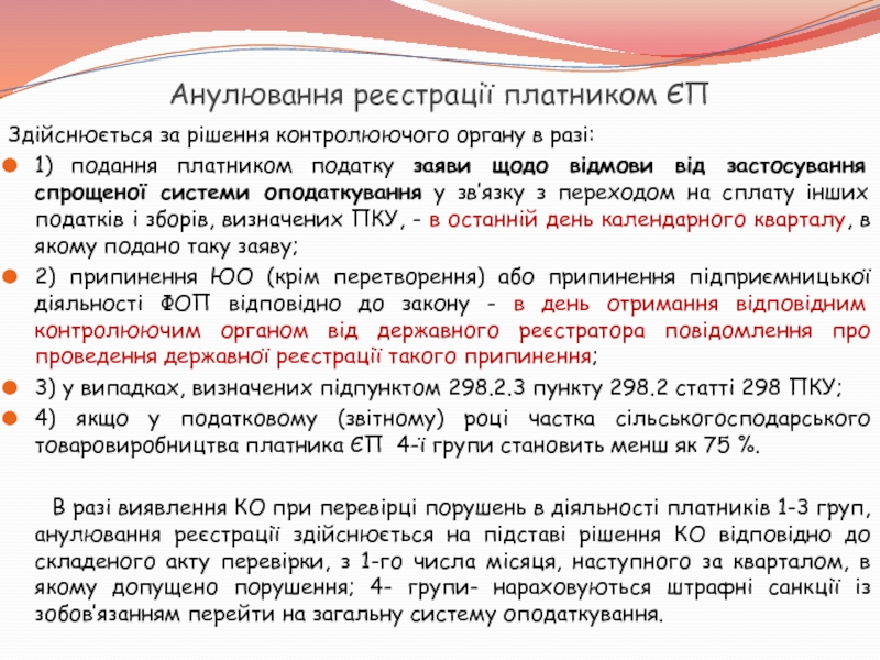 В разі виявлення КО при перевірці порушень в діяльності платників 1-3 груп, анулювання реєстрації здійснюється на підставі рішення КО відповідно до складеного акту перевірки, з 1-го числа місяця, наступного за кварталом, в якому допущено порушення; 4- групи- нараховуються штрафні санкції із зобов’язанням перейти на загальну систему оподаткування.