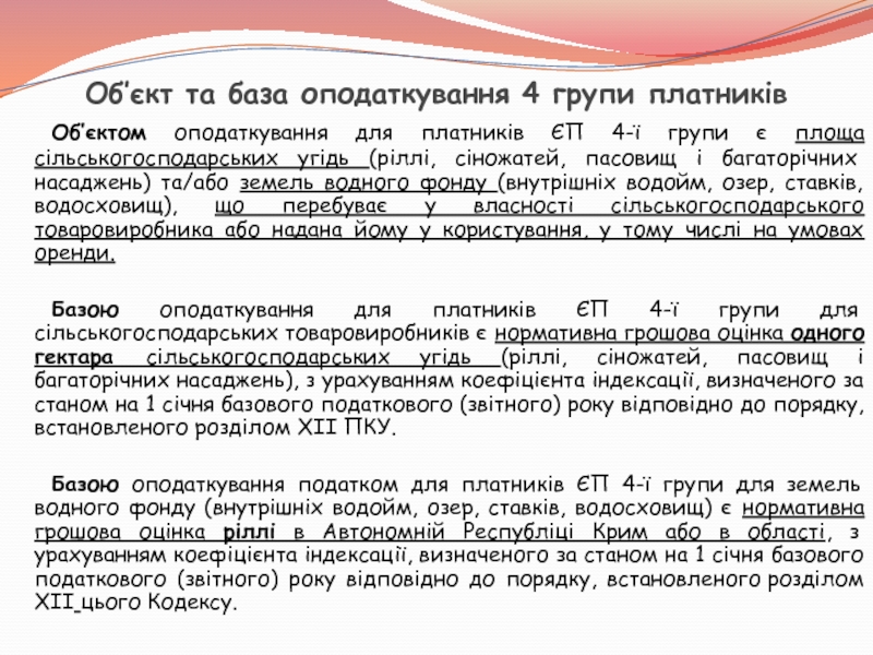 Базою оподаткування для платників ЄП 4-ї групи для сільськогосподарських товаровиробників є нормативна грошова оцінка одного гектара сільськогосподарських угідь (ріллі, сіножатей, пасовищ і багаторічних насаджень), з урахуванням коефіцієнта індексації, визначеного за станом на 1 січня базового податкового (звітного) року відповідно до порядку, встановленого розділом ХІІ ПКУ.