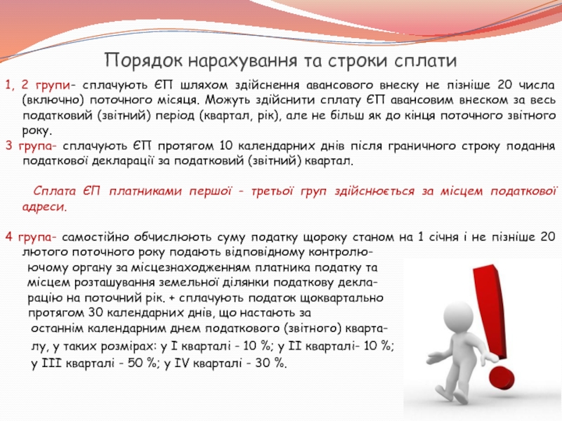 4 група- самостійно обчислюють суму податку щороку станом на 1 січня і не пізніше 20 лютого поточного року подають відповідному контролю-