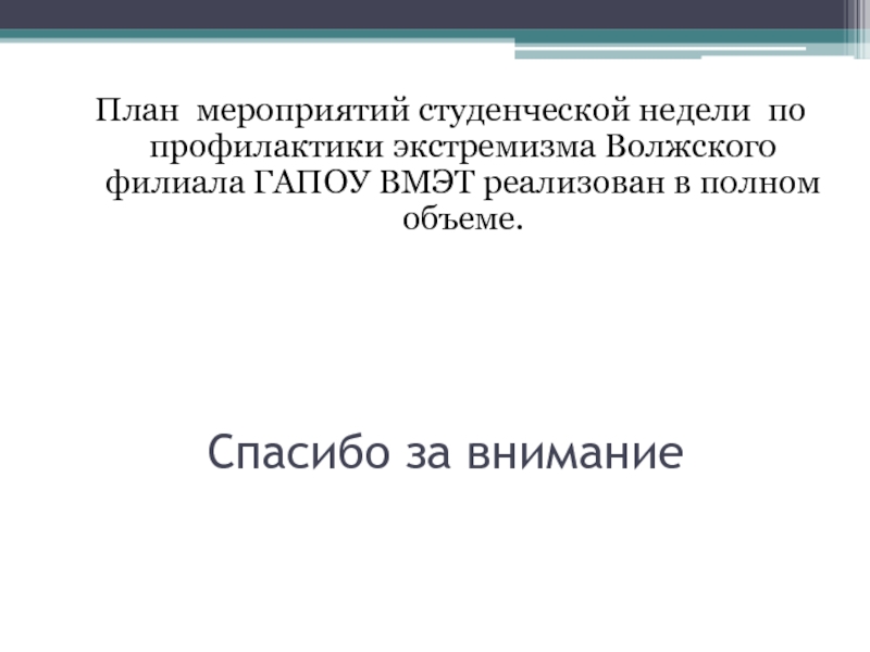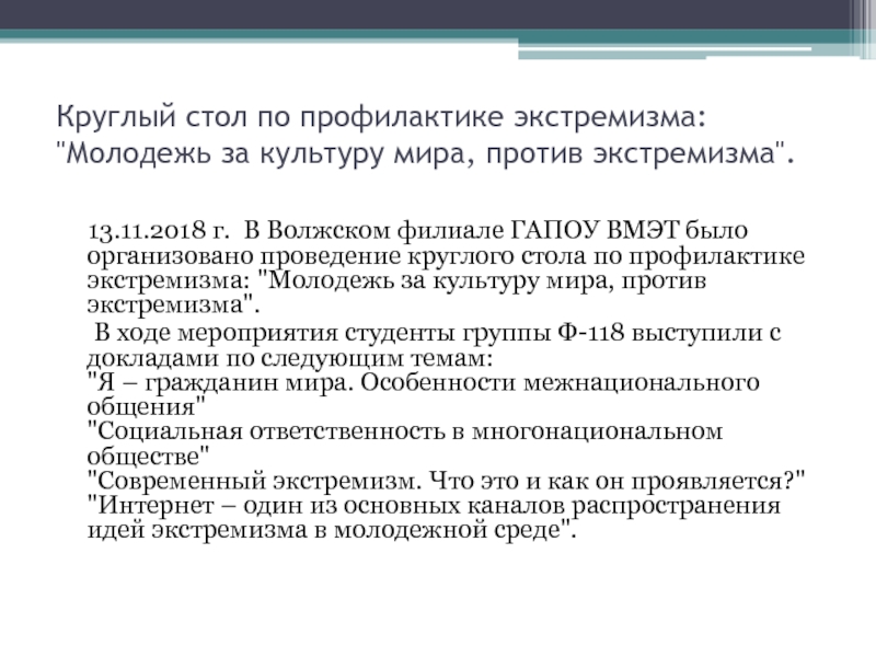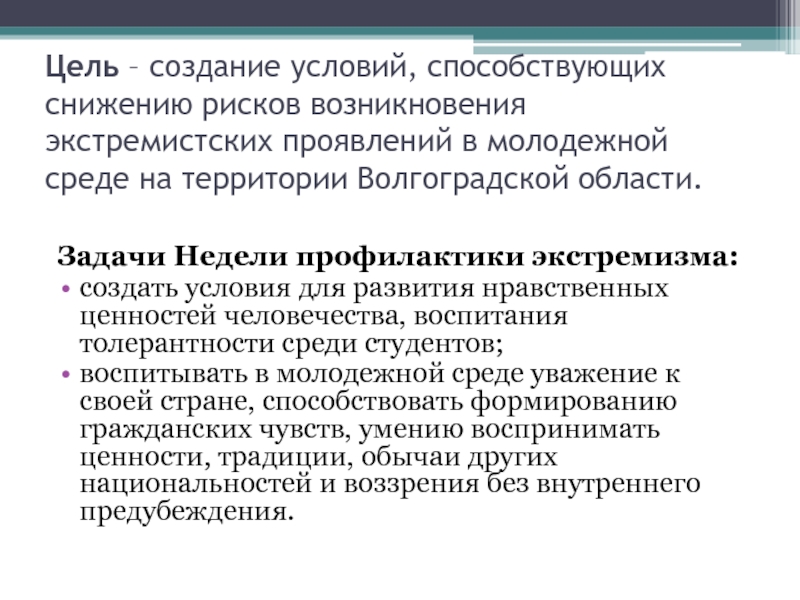 экстремизма: создать условия для развития нравственных ценностей человечества, воспитания толерантности среди студентов;