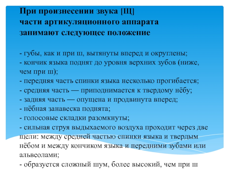 язык менее напряжен, чем при [щ] , упирается в дно полости рта, выдыхаемый