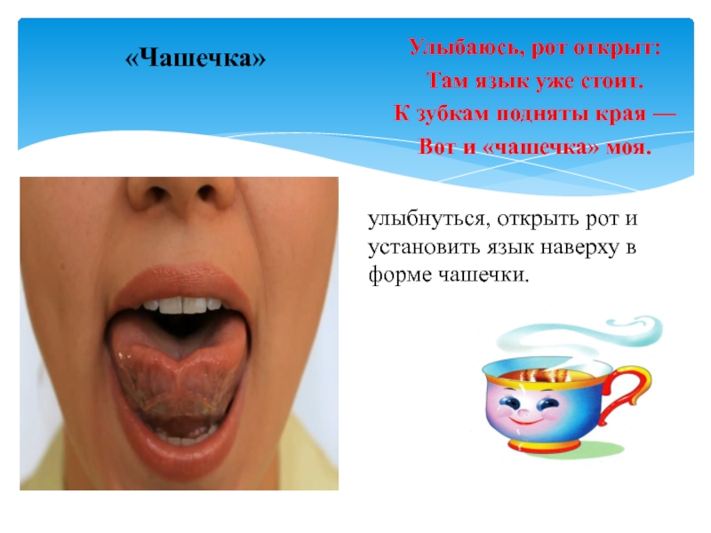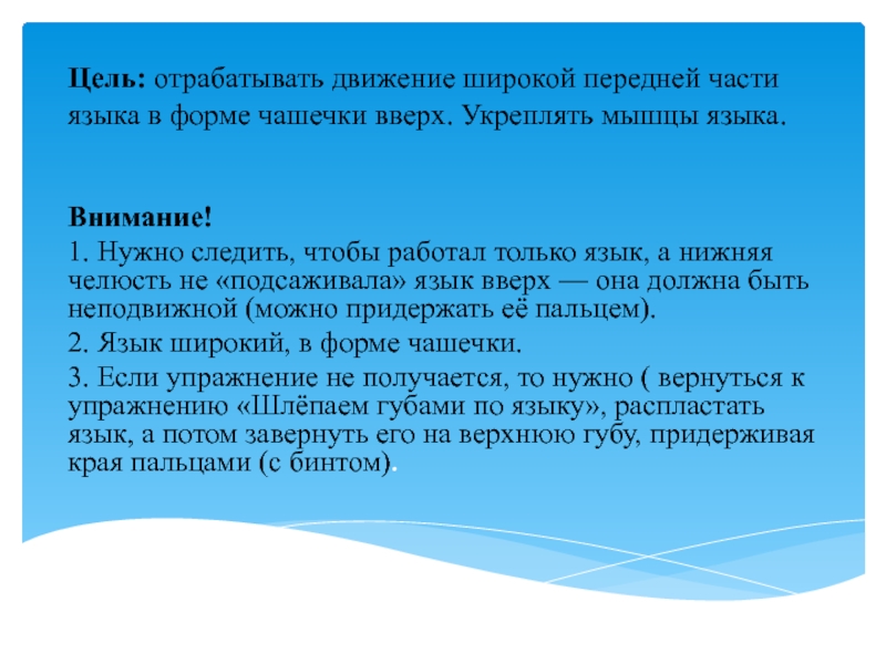 Слайд 15Цель: отрабатывать движение широкой передней части языка в форме чашечки