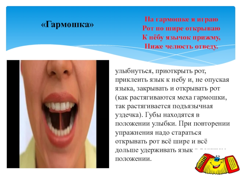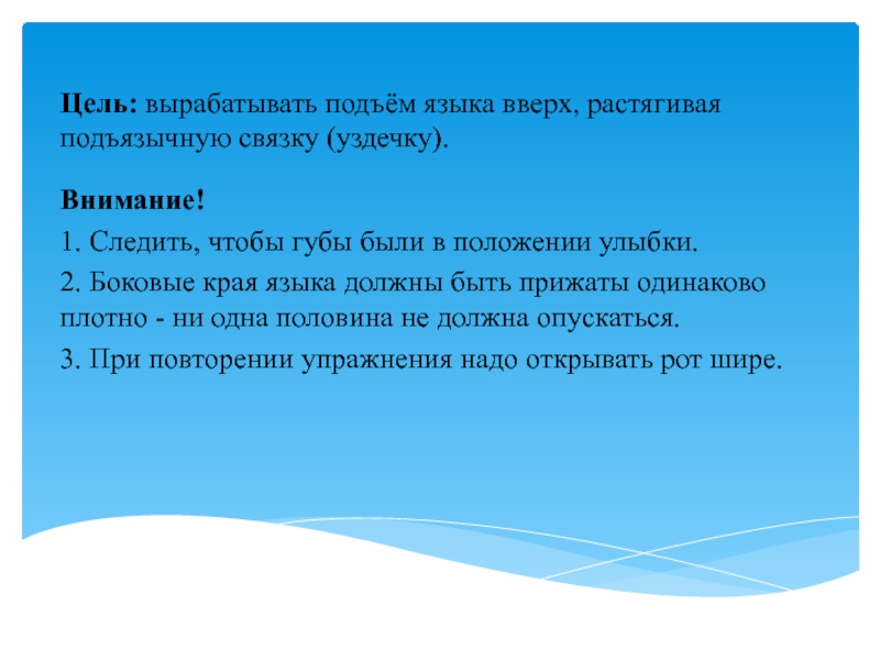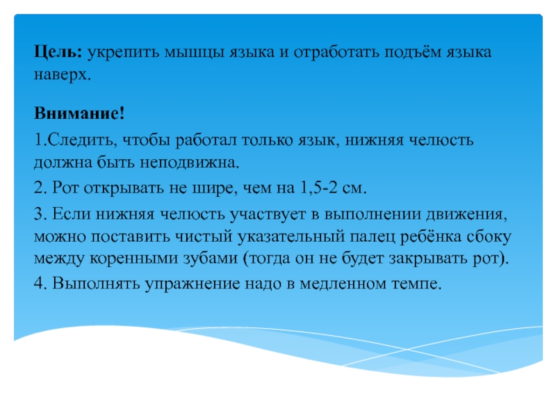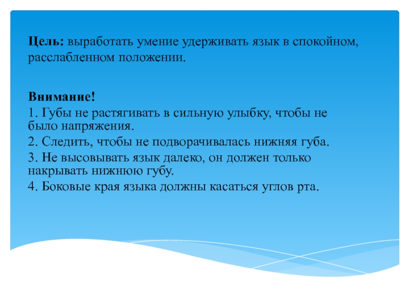 Слайд 11Цель: выработать умение удерживать язык в спокойном, расслабленном положении.