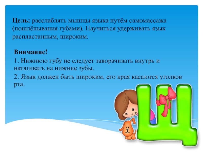 Слайд 13Цель: расслаблять мышцы языка путём самомассажа (пошлёпывания губами). Научиться удерживать