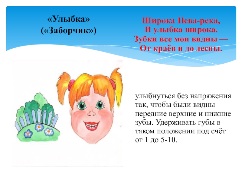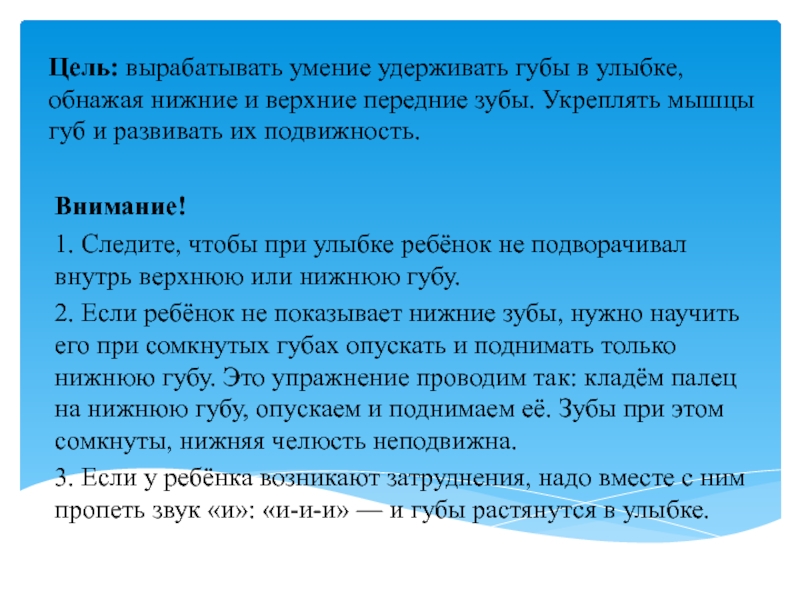 Слайд 9Цель: вырабатывать умение удерживать губы в улыбке, обнажая нижние и