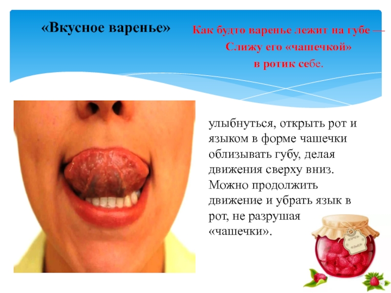 облизывать губу, делая движения сверху вниз. Можно продолжить движение и убрать язык в рот, не разрушая «чашечки».