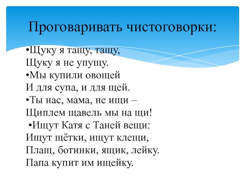Слайд 42Дима тащит щуку. Щенок щиплет щетку. В ящике пищит щенок.