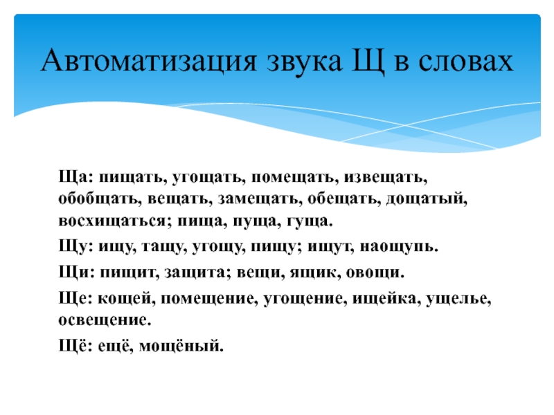 Слайд 41Ща: пищать, угощать, помещать, извещать, обобщать, вещать, замещать, обещать, дощатый,