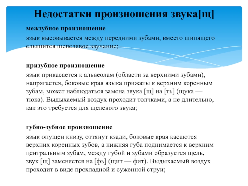 свистящее произношение — язык прижимается к нижним центральным зубам, на спинке образуется желобок, боковые края языка прижимаются к верхним коренным зубам, губы при этом сближены, округлены, напряжены, зубы сближены, выдыхаемый воздух проходит прохладной суженной струей по средней линии языка, звук [щ] заменен на [сь] (щупальце — сюпальце);