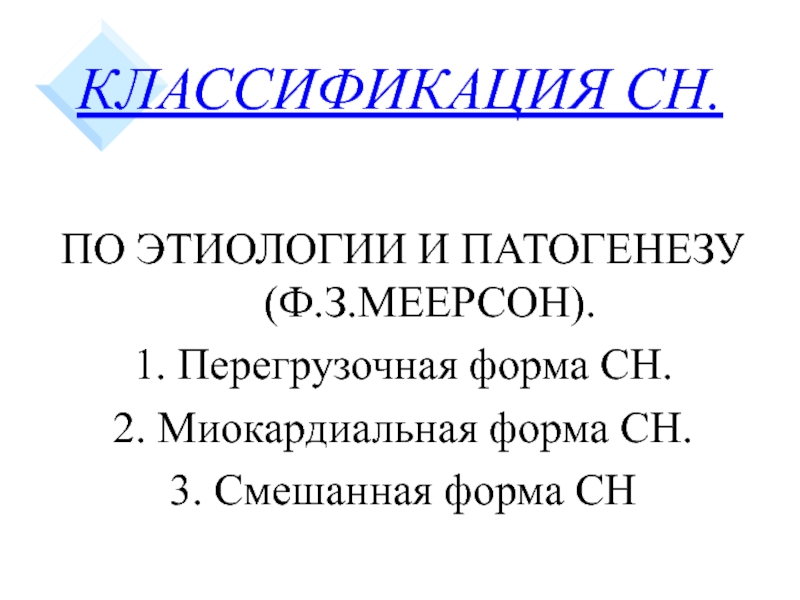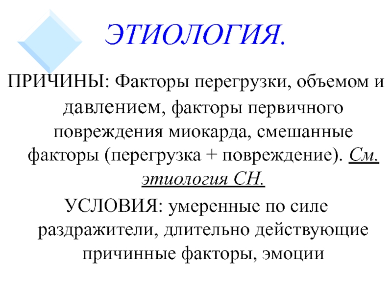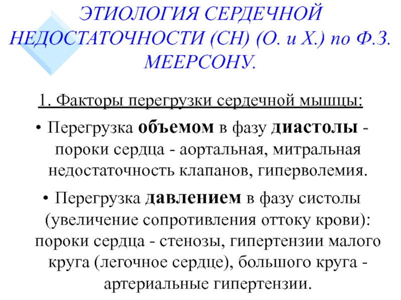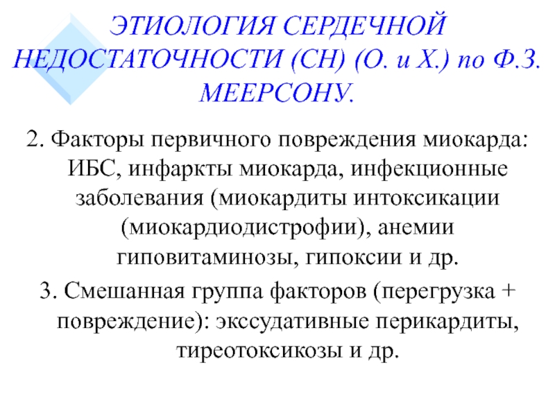 Слайд 10ЭТИОЛОГИЯ СЕРДЕЧНОЙ НЕДОСТАТОЧНОСТИ (СН) (О. и Х.) по Ф.З.МЕЕРСОНУ.